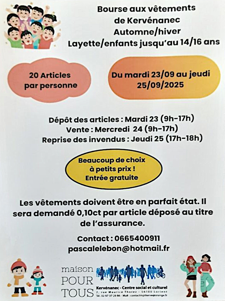Bourse aux vêtements à Kervenannec – Entrée gratuite – Le dépôt des vêtements se fait le mardi 23 septembre de 9h à 17h